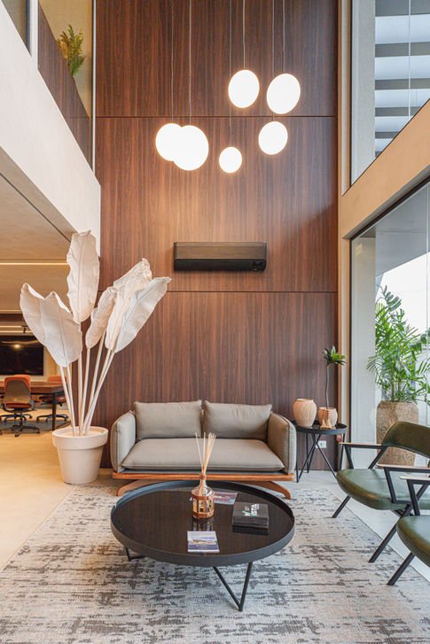 Projeto arquitetônico para a ORIGINI Imóveis em que destacamos a integração e funcionalidade em um ambiente corporativo. A composição valoriza o uso de materiais nobres como madeira natural, pedra e metal, reforçando a identidade institucional com sofisticação. O pé-direito duplo da recepção cria imponência e amplitude, enquanto a iluminação linear e os pendentes circulares enfatizam a verticalidade e conduzem o olhar. O layout é bem definido, com espaços de trabalho e reuniões, promovendo a experiência do cliente e a valorização da arquitetura como ferramenta de representação da marca.